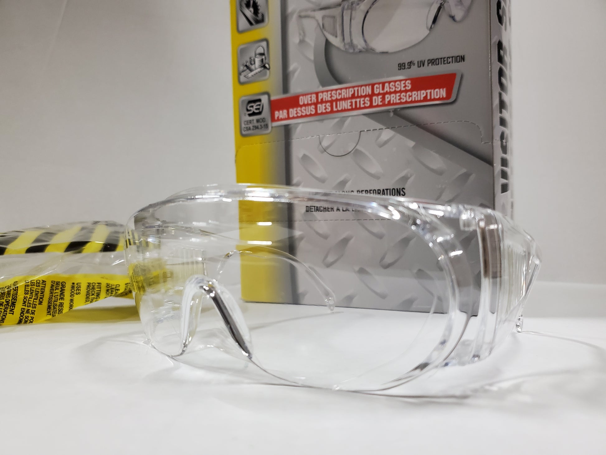99% UV Protection Over Prescription Glasses Fits with or without glasses Extra Wide Lens Vented Temples Impact-resistant Lens CERT. MOD. CSA Z94.3-15 20 pairs in the box